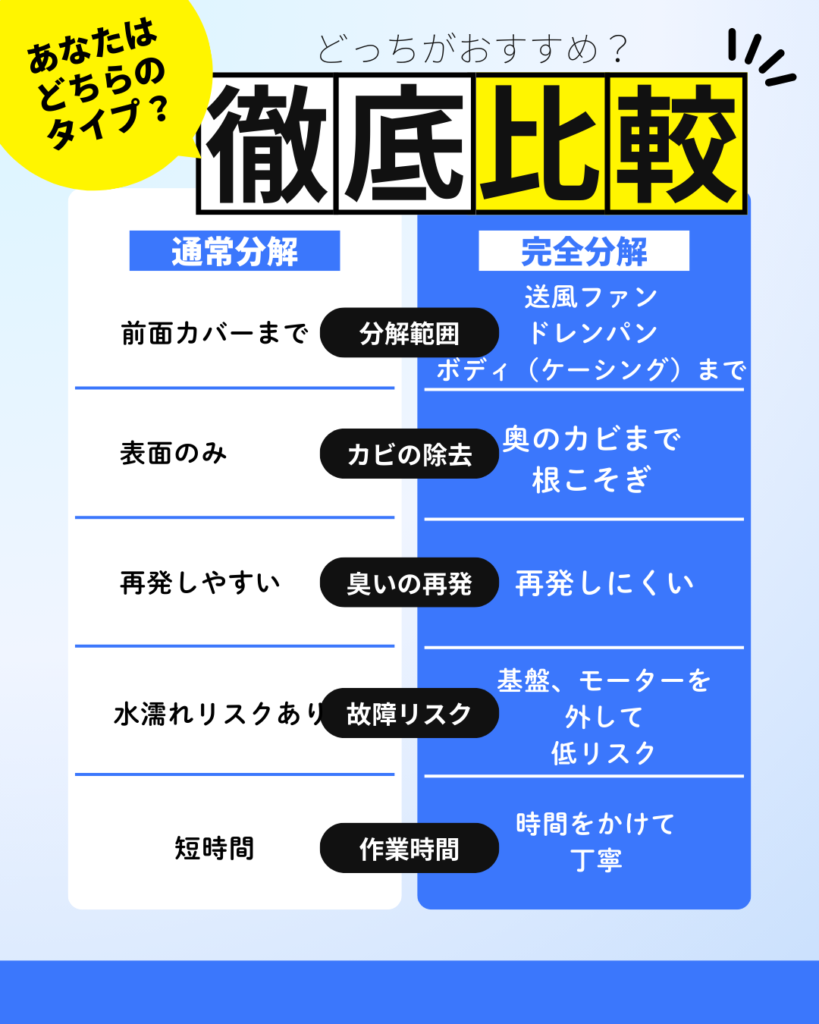 特に、カビ臭・効きの悪さ・水漏れの多くは、表面だけキレイにしても解決しないケースがあります。